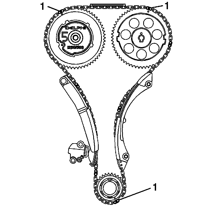 The dark links (1) on the chain should be aligned with marks on sprockets as shown.