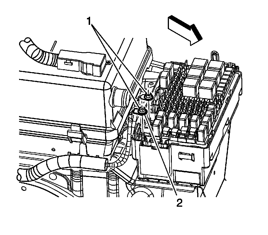 11. Remove the nuts (1) securing the battery cables to the underhood fuse block.