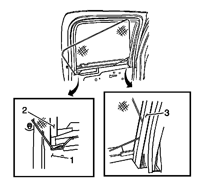 1. Install the rear door window to the rear door by inserting the front edge of the window into the window channel (3), and sliding the rear of the window down between the upper window channel (2) and the inner panel (1).