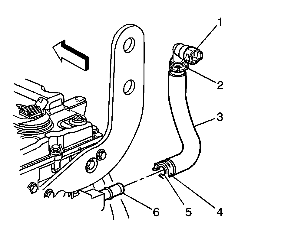 4. Remove the heater inlet hose (3) from the inlet hose fitting (6) at the engine block.