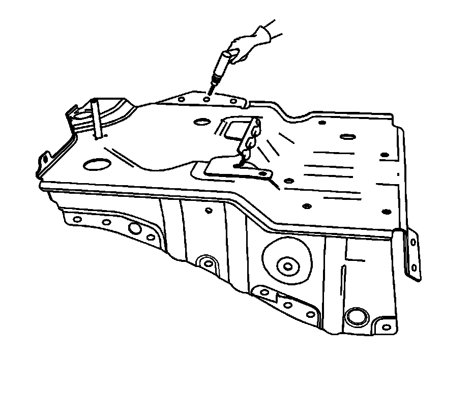 1.Drill 8 mm (5/16 in) plug weld holes as necessary in locations noted from the original battery tray.