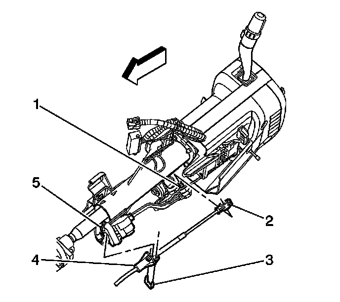 13. Push the range selector cable locking tabs inward toward each other to release from the steering column bracket (5).