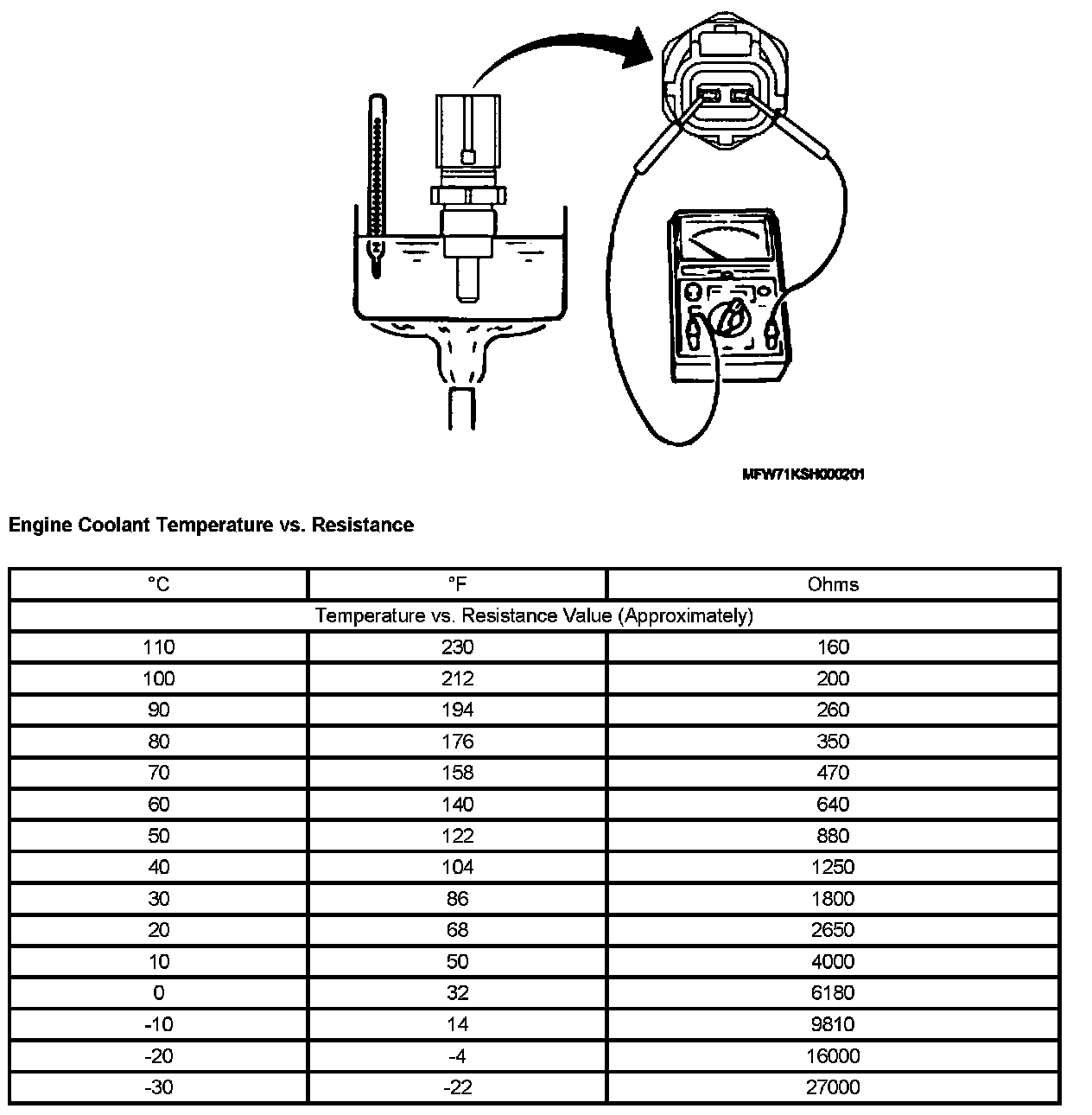 - Immerse the ECT sensor into water, and check if the resistance value matches with the chart.
