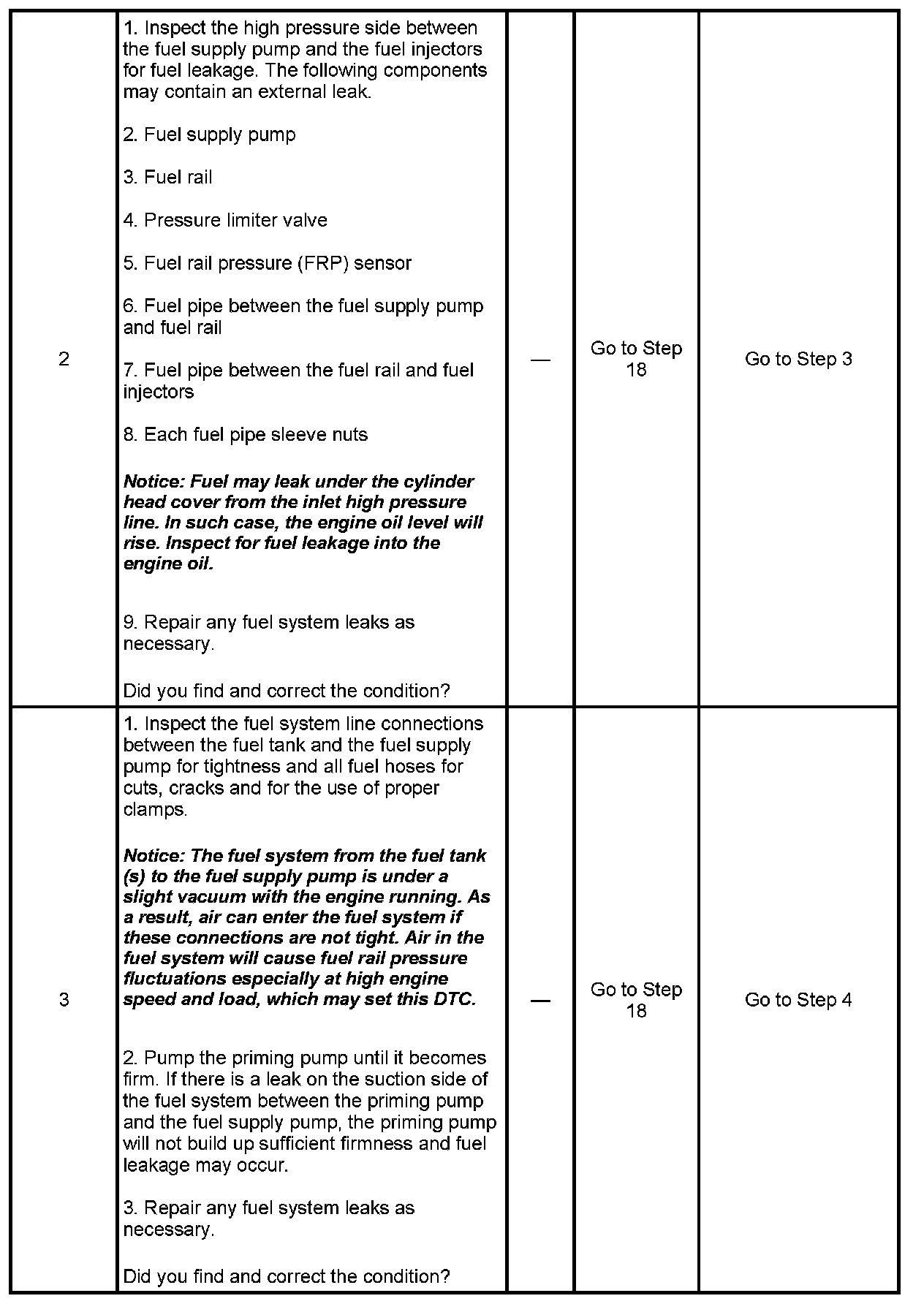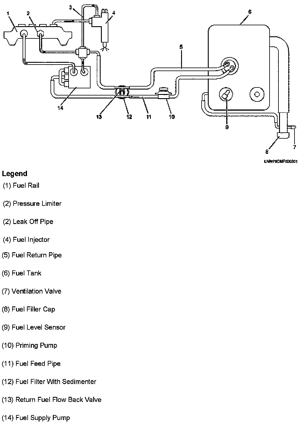 The common rail fuel system is comprised of two fuel pressure sections: a suction side between the fuel tank and the fuel supply pump and a high-pressure side between the fuel supply pump and the fuel injectors. Fuel is drawn from the fuel tank via a feed pump and then pumped into the fuel rail by two plungers, all of which are internal to the fuel supply pump. This high pressure is regulated by the ECM using the fuel rail pressure (FRP) regulator dependant upon values from the FRP sensor attached to the fuel rail. In case of fuel rail overpressure, a pressure limiter valve threaded into the fuel rail will open to release overpressure and return fuel back to the fuel tank. The Fuel System Check diagnostic table directs the service technician to the appropriate fuel system diagnosis. The diagnostic table assumes the following conditions are met: