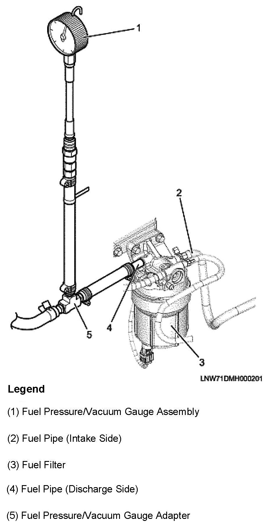 NOTE: The fuel pressure/vacuum gauge assembly (gauge (1)) and the fuel pressure/vacuum gauge adapter (adapter (5)) must be cleaned before connect to the fuel line. Otherwise, foreign material adherent to the tools may damage the fuel supply pump.