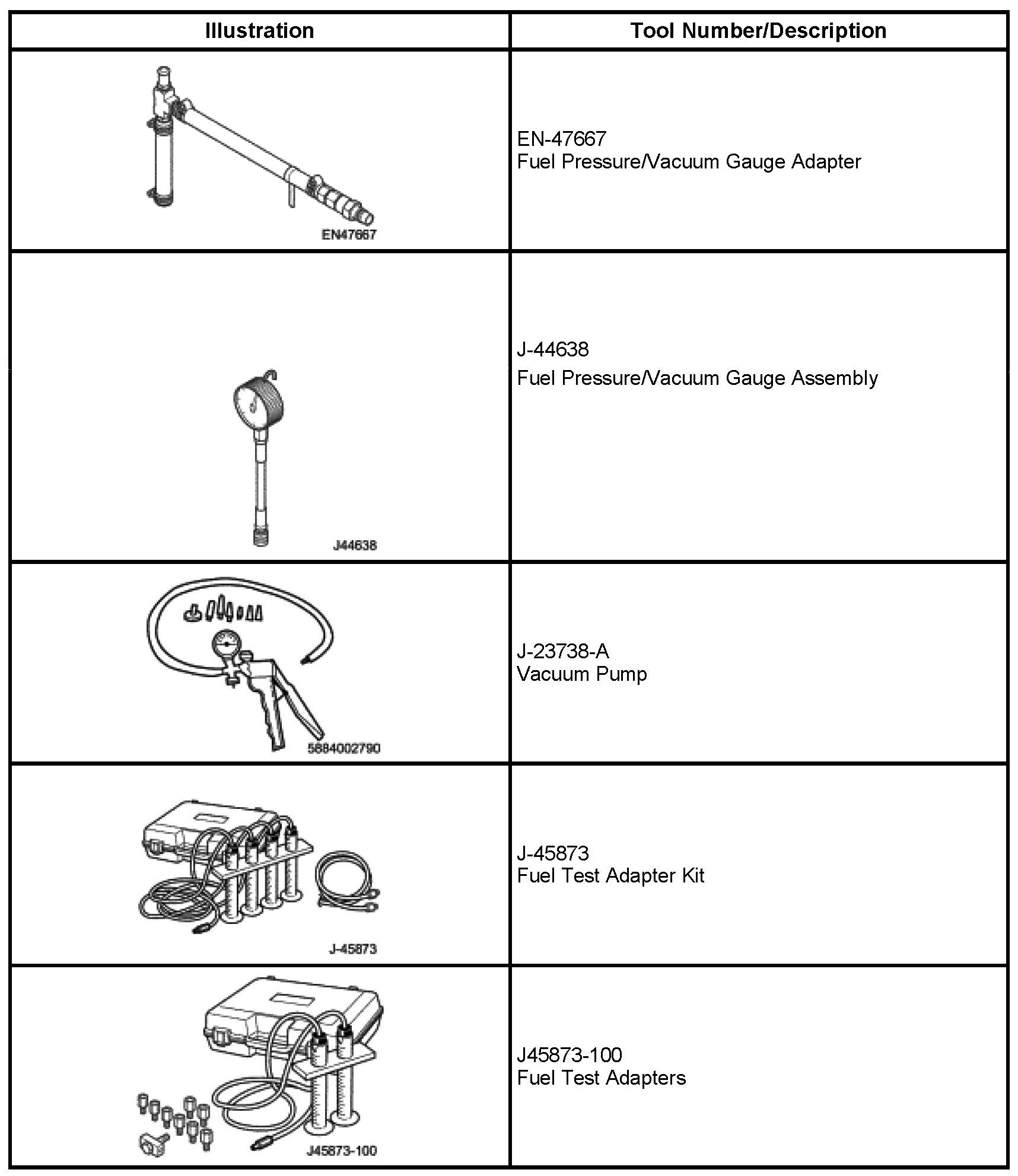 3. Connect the gauge (1) with hose to the adapter (5). Special tool Fuel pressure/vacuum gauge assembly: J-44638