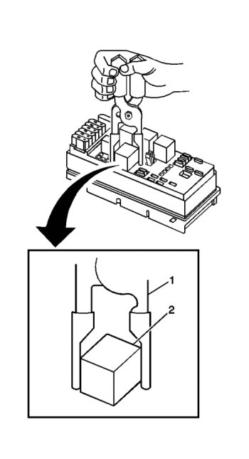 3. Using the J43244 (1) position the tool on opposing corners of the relay (2).