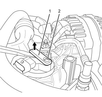 2. Lift up on the bracket (1) and slide off of the intake manifold pin (2).