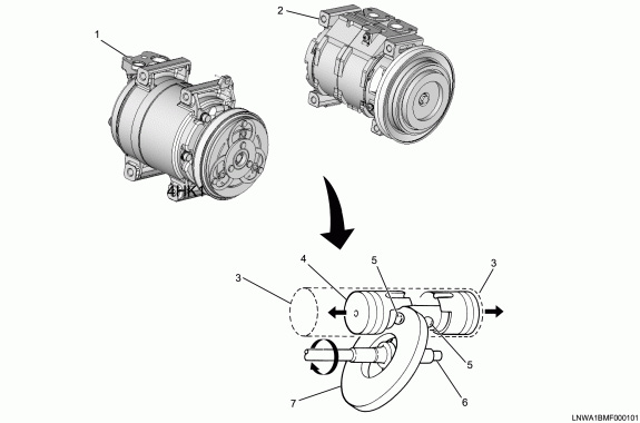 The swashplate (skewed plate) is assembled to the shaft, such that rotation of the shaft converts the rotational motion of the swashplate into piston strokes, which sucks in and compresses the refrigerant.