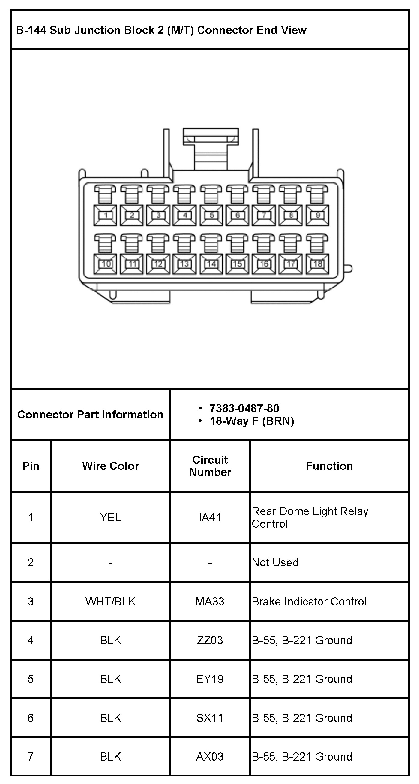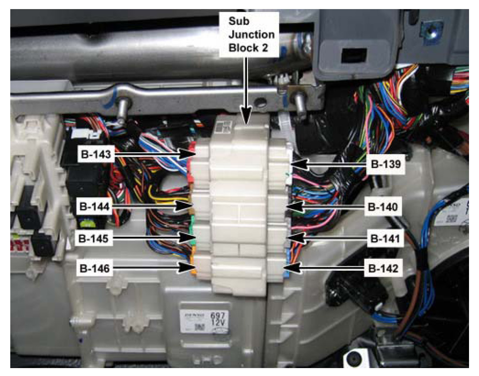 B-144 Sub Junction Block 2 (A/T)Behind the Center of the I/P, On the Right of the In-Cab Fuse Relay Center