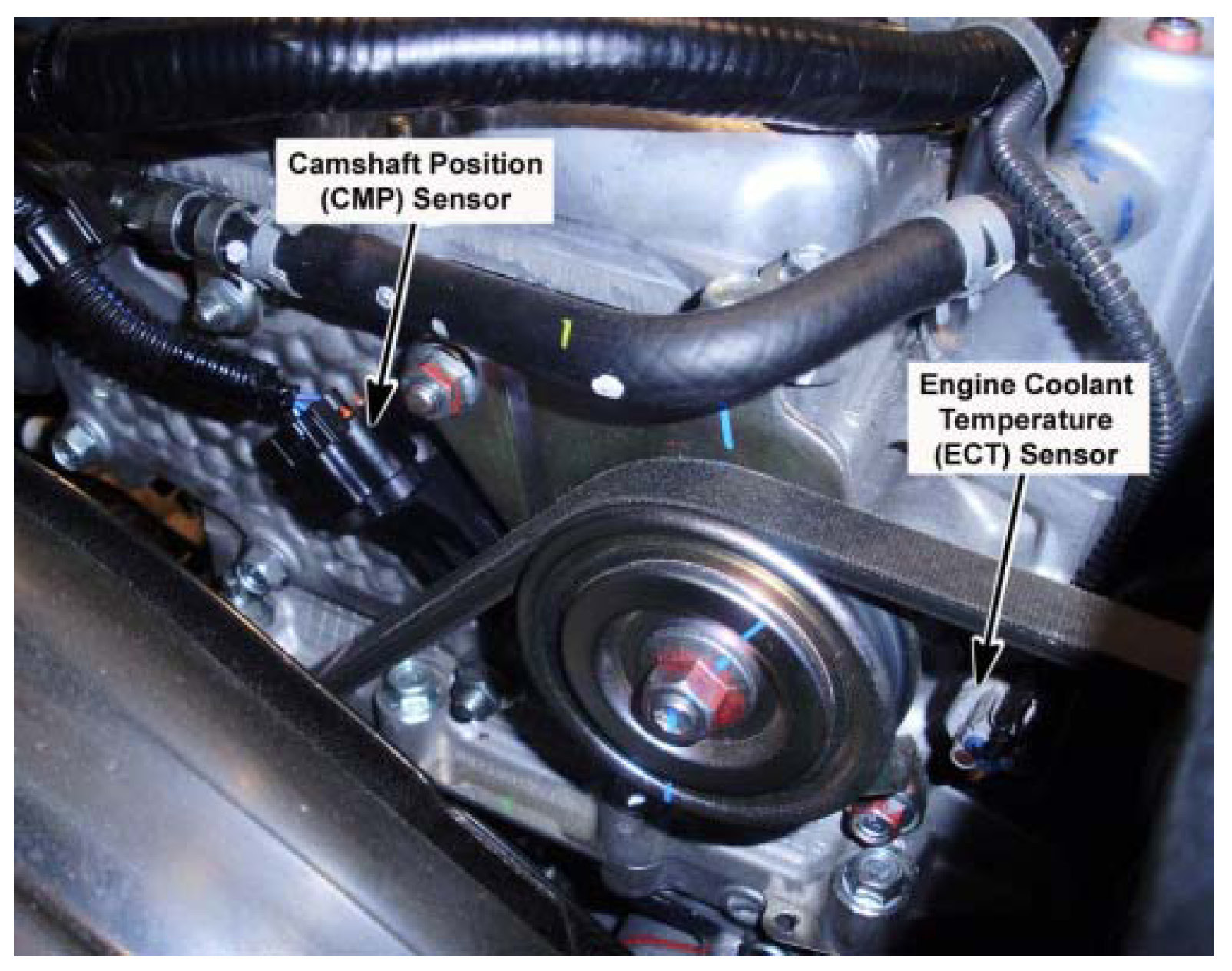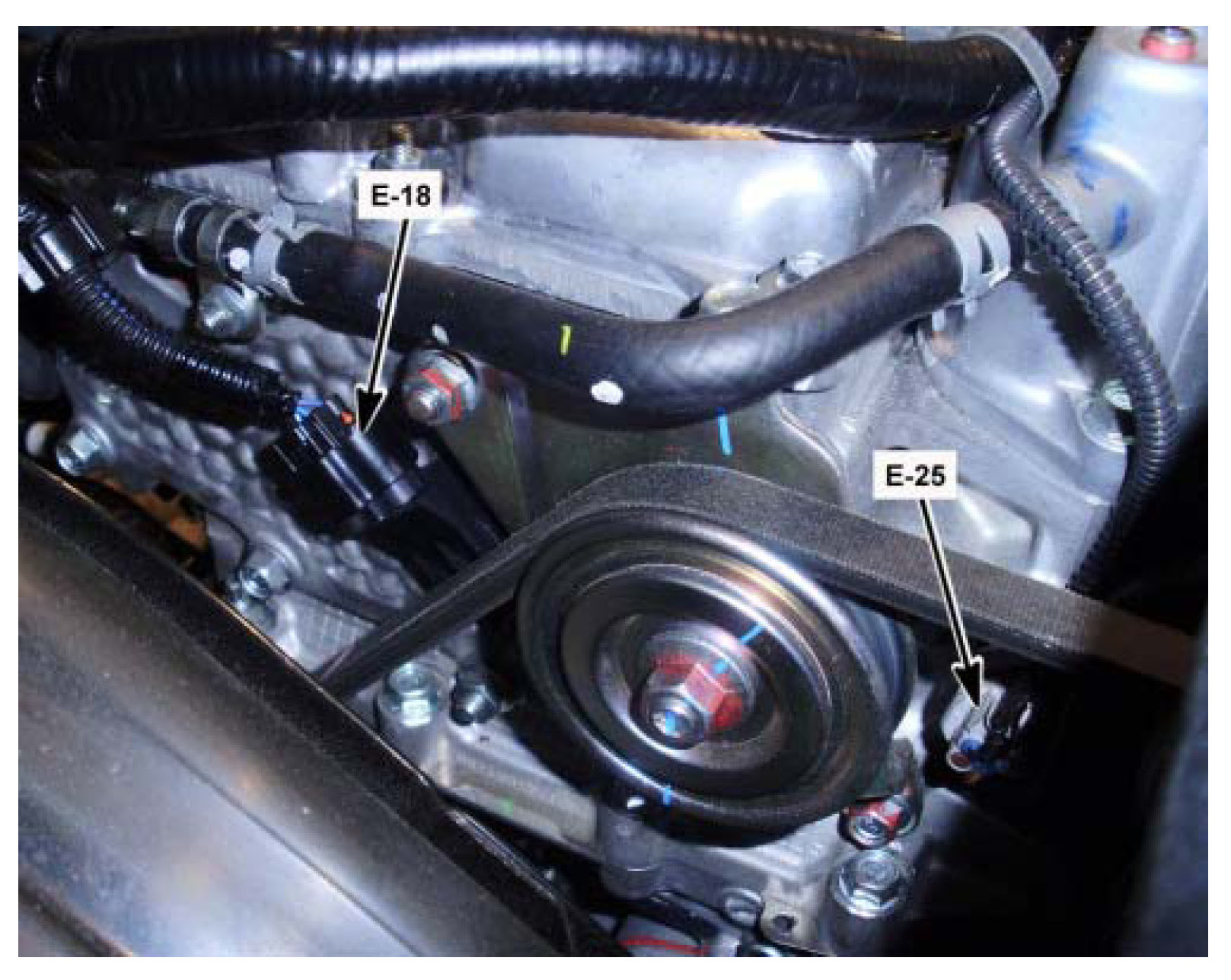 Left Front of Engine, Below the Upper Radiator Hose