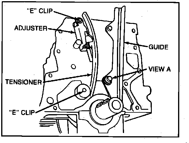 39. Remove E-clips, then chain adjuster and tensioner, Fig. 10. Inspect components for wear or damage. Also inspect chain guide and oil jet, view ``A'', Fig. 10.