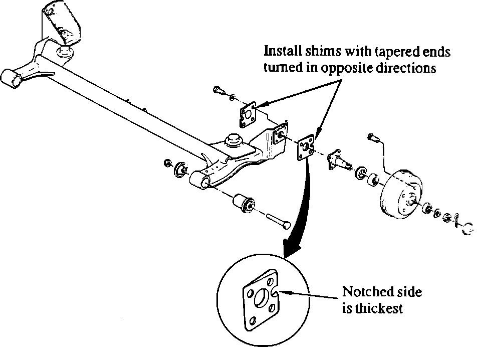 2. Measure rear toe. If toe is incorrect, installing tapered shims (two per wheel) as follows will change toe 2 mm per wheel.