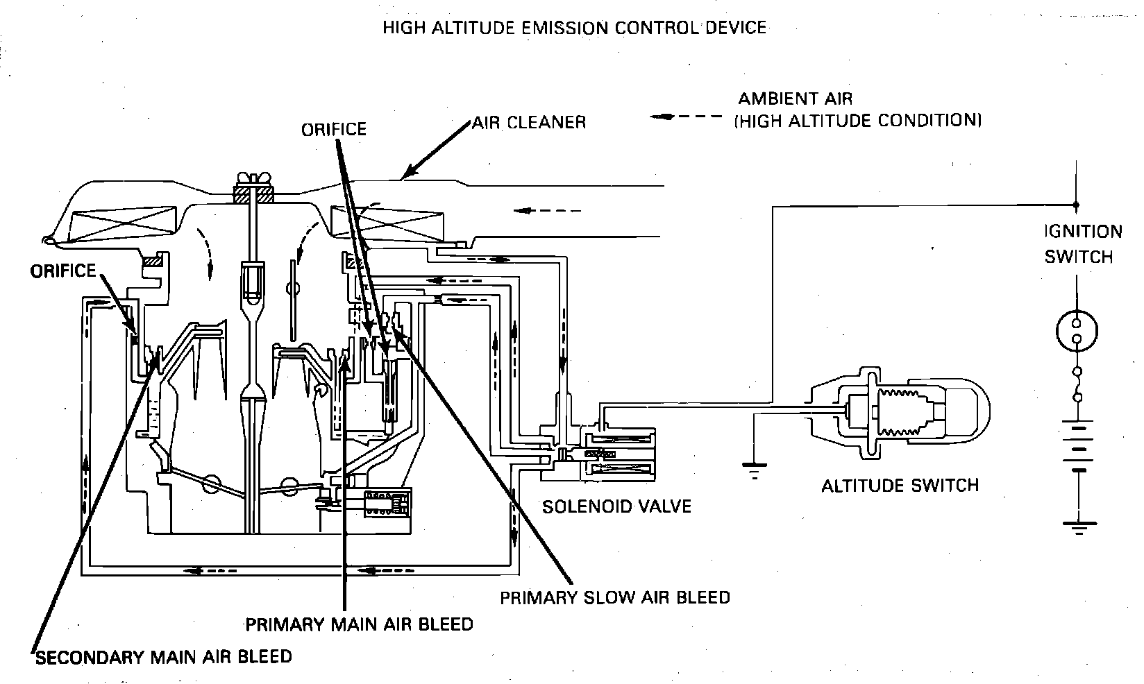 To avoid an excessively rich carburetor mixture at high altitudes (due to decreased air density), the system supplies additional air through the carburetor metering orifices. At a predetermined altitude, the altitude sensing switch will close the circuit between the battery and solenoid valve.