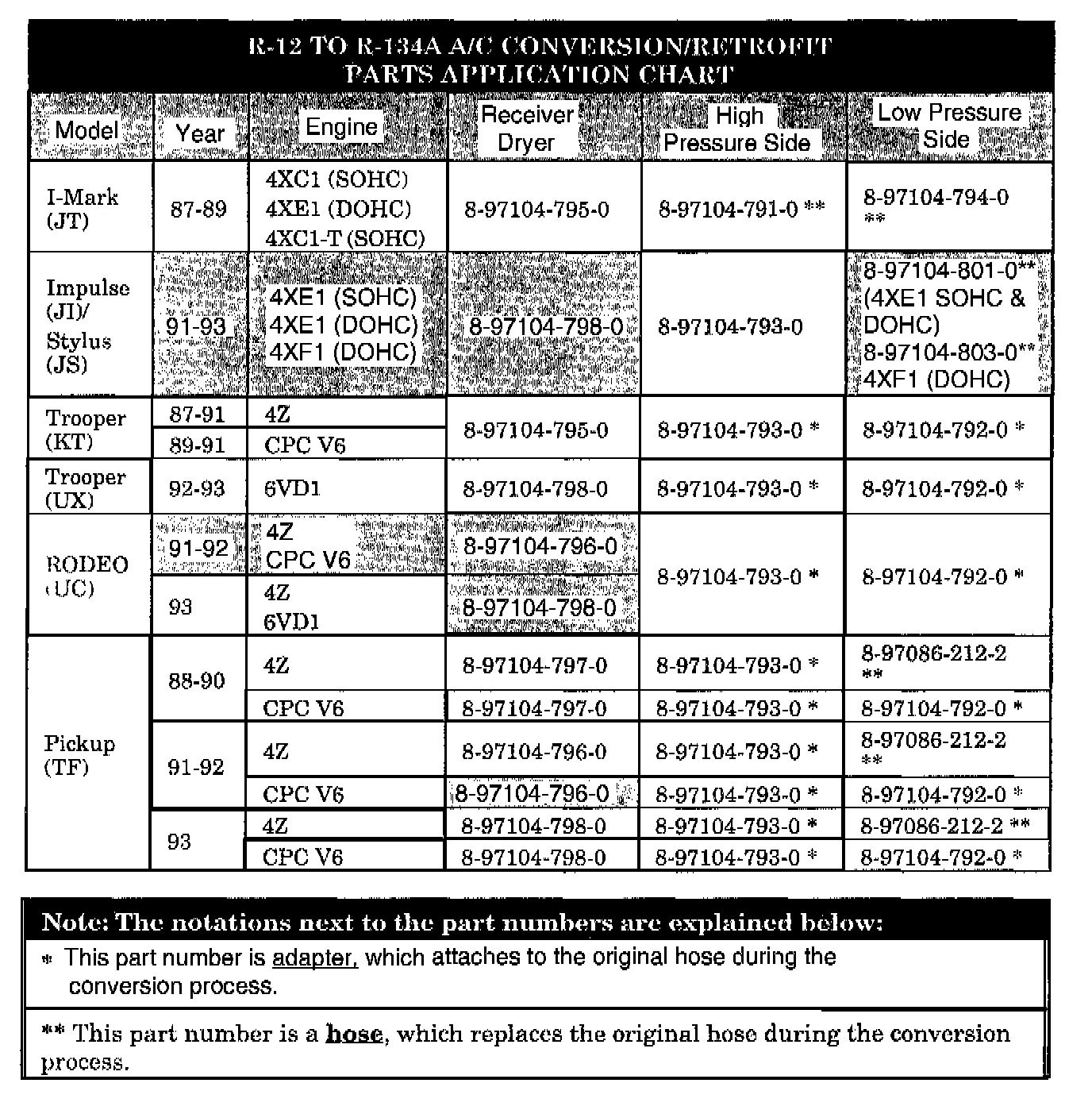 For all A/C system retrofit procedures, new receiver driers, refrigerant oils, refrigerant R-134a, and new caution labels are required. Depending on application, either R-134a service valve adapters or hoses equipped with the R-134 service ports are required in both the high and the low-pressure side. Follow the information outlined in this bulletin for the special procedures and parts information. When applicable, refer to the appropriate published workshop manual to supplement the procedures in this bulletin, such as system diagnostics, component location and service information.