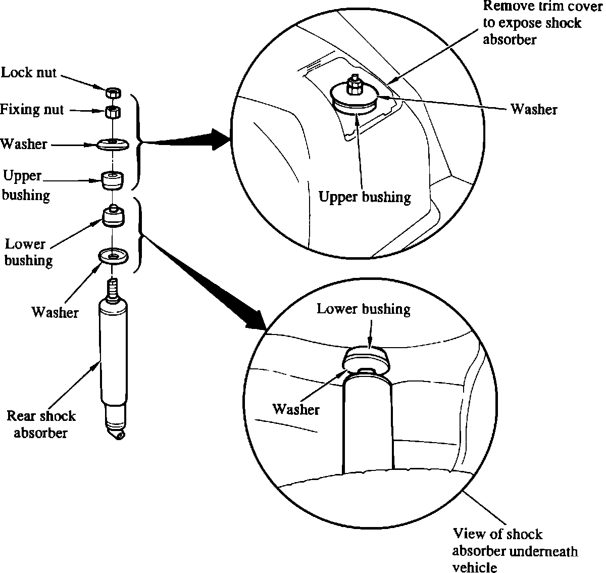 Replace the bushings and washers in both rear shock absorbers, as follows: