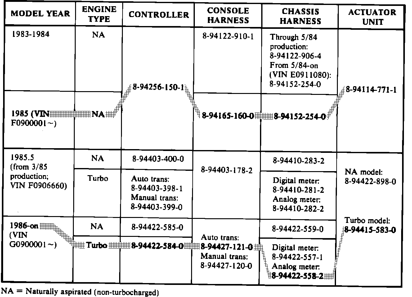 For example, the first shaded line shows the part numbers which are installed on a 1985 model. The second shaded line shows the part numbers which are installed on a 1986 Turbo with automatic transmission and analog gauges.