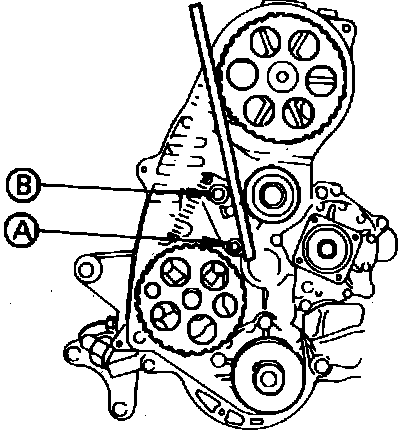 7. Install timing belt and loosen bolt ``B'' to allow tension spring to tighten belt. Ensure marks on gears are still properly aligned.