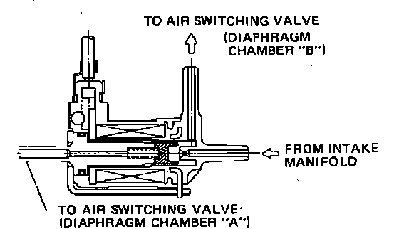 When energized, the Vacuum Switching Valve connects diaphragm chamber ``B'' of the air switching valve to intake manifold, allowing application of manifold vacuum. When the solenoid plunger is de-energized, the Vacuum Switching Valve ports are closed, thereby diaphragm chamber ``A'' is connected to diaphragm chamber ``B''.