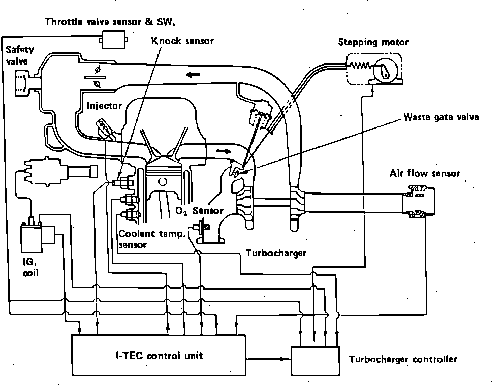 The turbocharger is an exhaust driven device which compresses the air charge being delivered to the engine through the intake system. The turbocharger increases engine power on a demand basis. Exhaust gases flow through a turbine that is connected through a shaft to the impeller wheel. During normal operation, the turbine does not rotate fast enough to boost air pressure. As speed increases, the air is compressed allowing a denser mixture to enter the combustion chambers, in turn developing more engine power during the combustion process. Intake manifold pressure (boost pressure) is controlled by a wastegate valve which is used to bypass a portion of the exhaust gasses around the turbine wheel at a predetermined point in the cycle, limiting boost pressure.