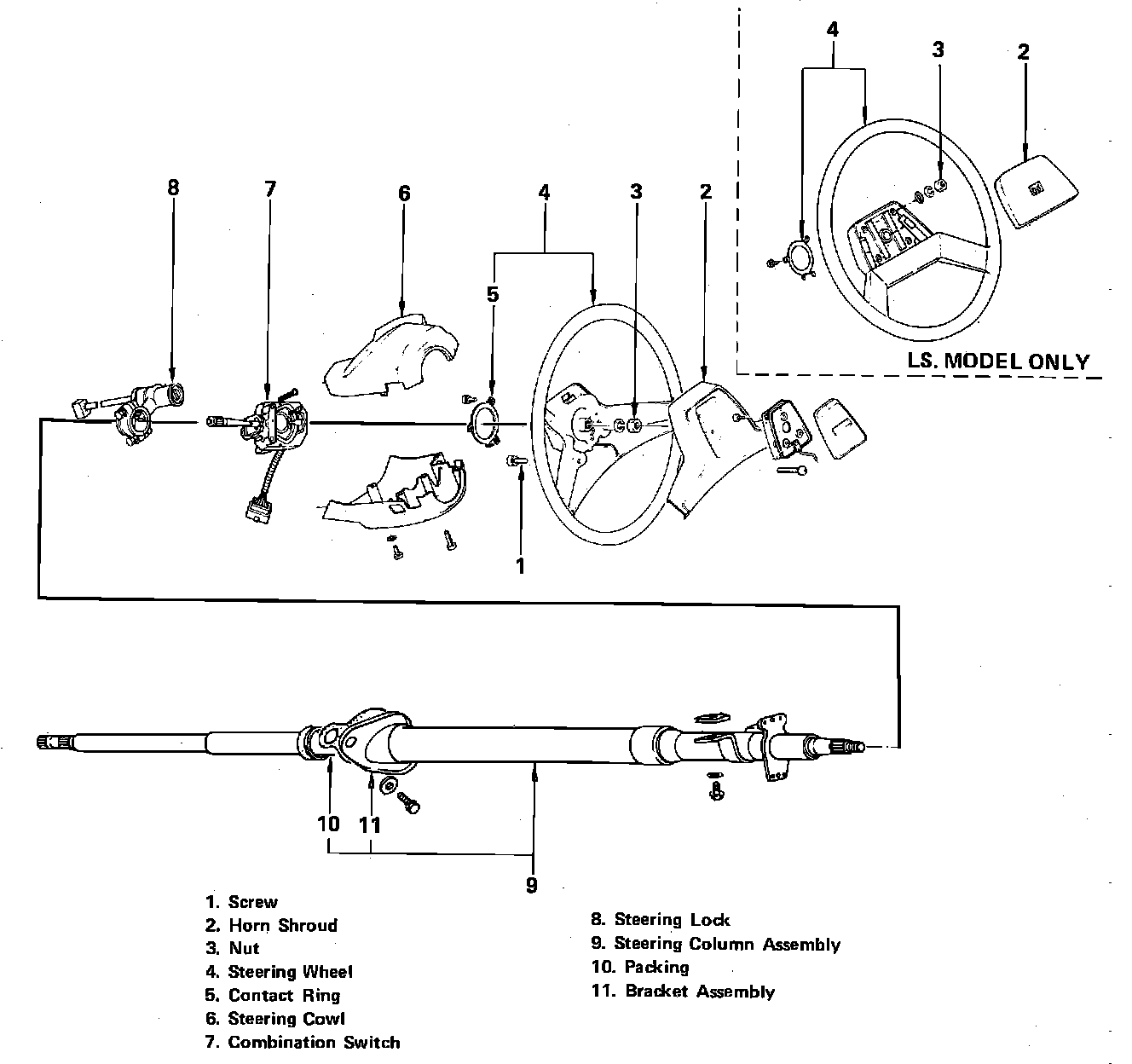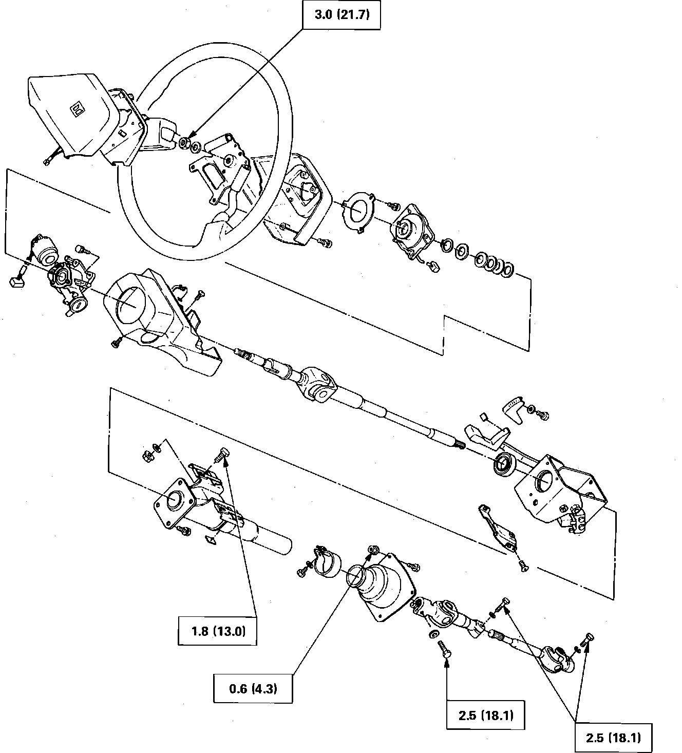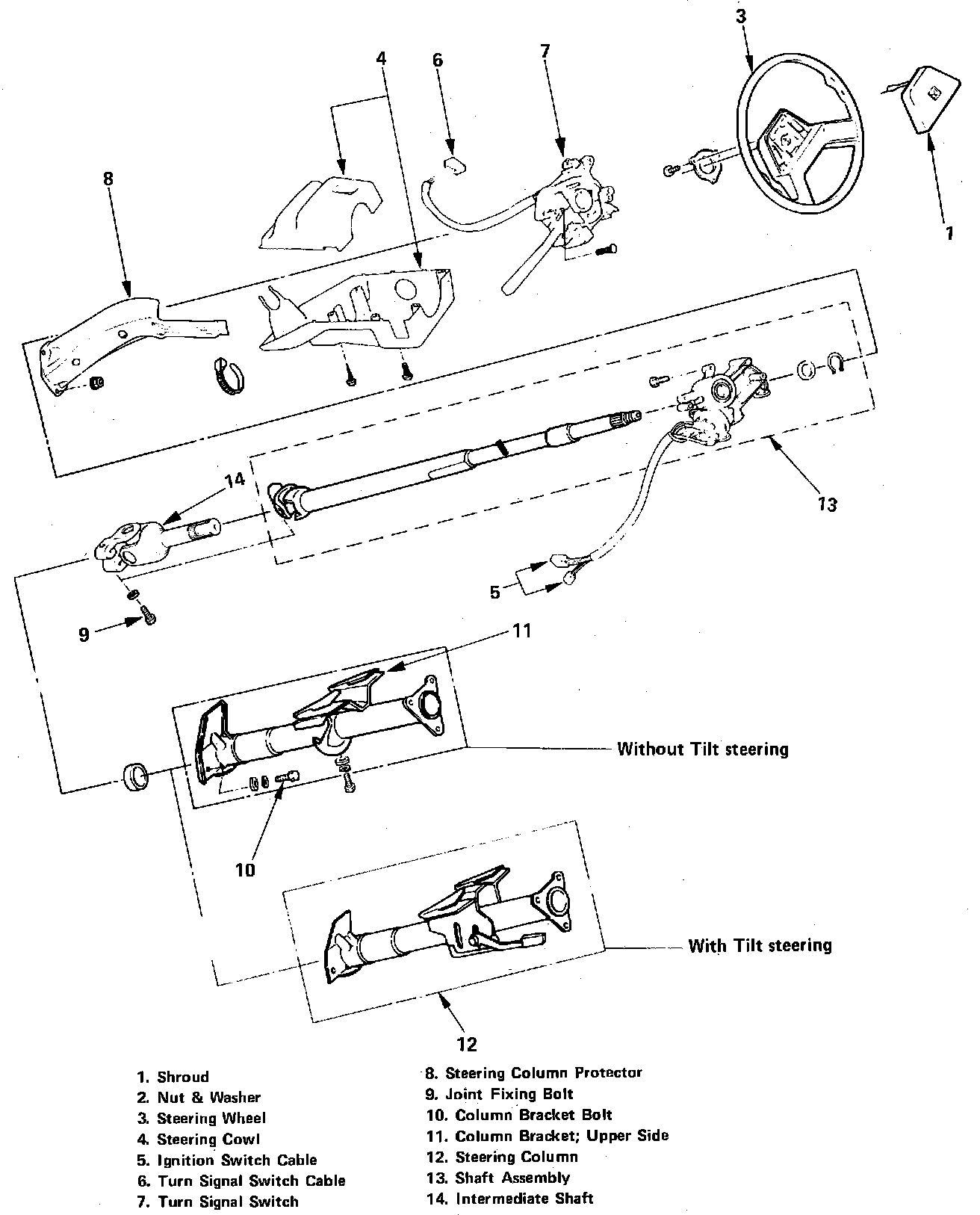 Refer to Figs. 1 through 4, for exploded view of steering column assembly. When disassembling the steering column, ensure to note bolt, screw and nut type, location and bolt tensile strength (usually a letter, number or marking on the bolt head. Ensure to check if nut removed from component is castellated or of the self-locking type). Ensure to replace any bolt, screw or nut with the same type. Do not attempt to replace a bolt, screw or nut with a lesser quality type bolt, screw or nut. Doing so will automatically compromise vehicle integrity and operator safety in the event of a collision.