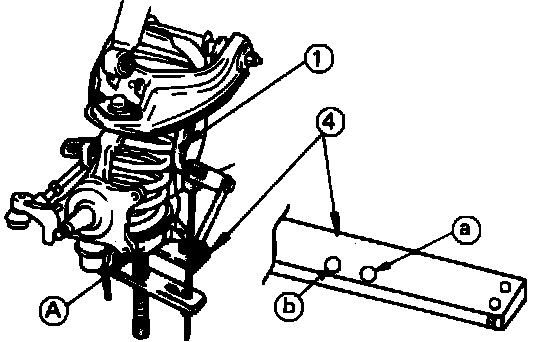 d. Set plate to lower link A using alignment hole in guide link plate 4. Install a suitable chain through one coil nearest top of spring and connect other end to the upper control arm to prevent spring from coming out.