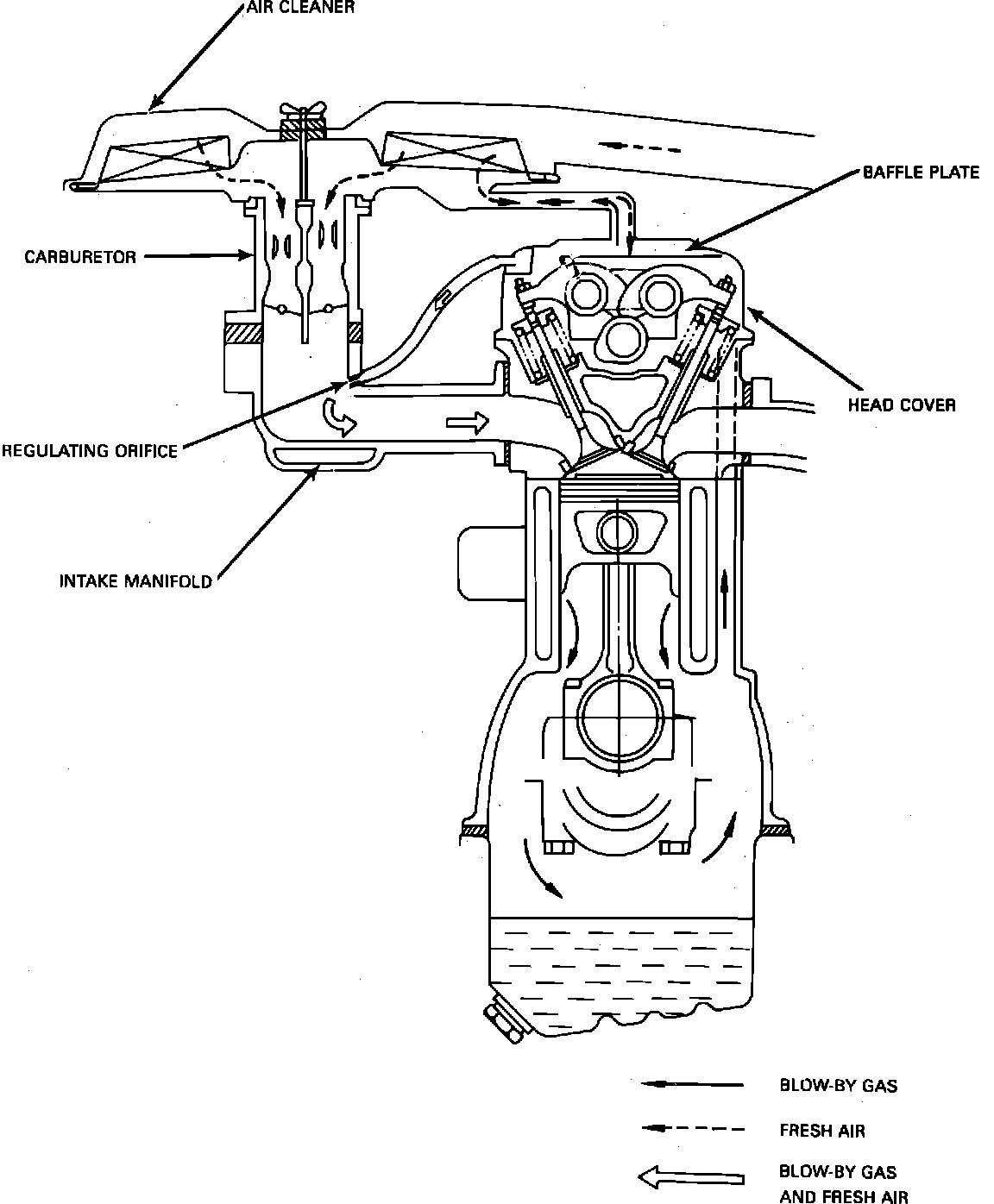 The regulating orifice controls blow-by gas suction. Under normal operating conditions, blow-by gas passing between the piston and the cylinder wall is mixed in the engine with fresh air from the air cleaner. The baffle plate, mounted in the head cover, separates oil particles from the blow-by gas. The blow-by gas is then drawn through the regulating orifice into the intake manifold to be reburned in the combustion chamber. With the engine operating at maximum speed, intake manifold negative pressure will not be sufficient to handle all of the blow-by gas. Some of the gas will be drawn into the air cleaner, through the rear end of the head cover.