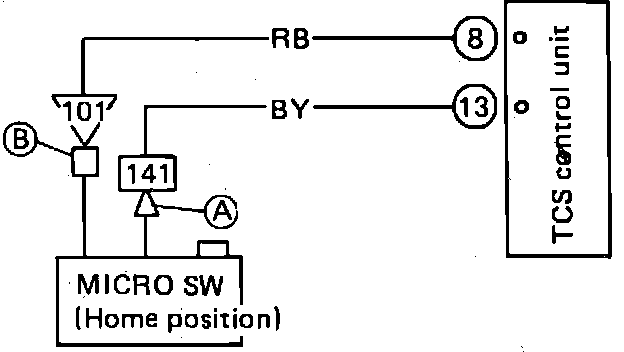 1. Check for continuity between connector terminal No. 8 and 13 on TCS control unit, Fig. 16, with contacts closed on stepping motor and micro switch Fig. 17. Ensure that TCS control unit and engine body harness are connected.
