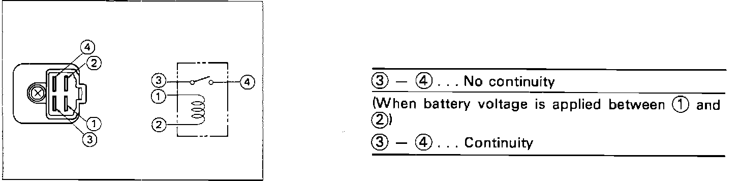 Remove relay, located near battery, and check continuity between terminals as described on image chart.
