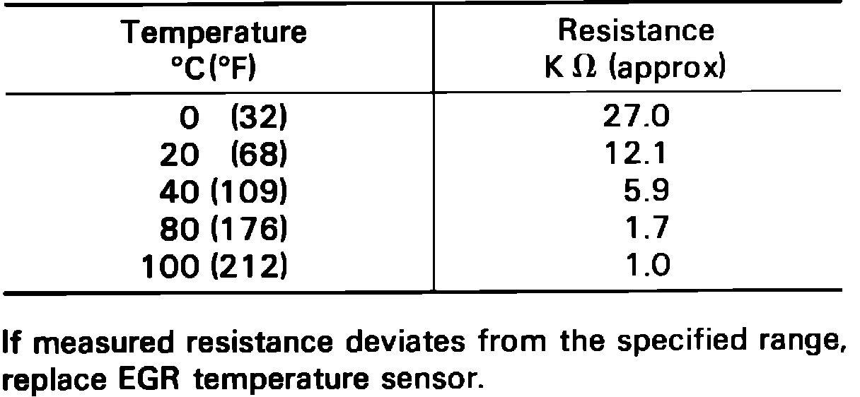 1. Heat EGR sensor Fig. 216 to a known value as indicated in the specification chart Fig. 217. If measure resistance is different that specified range, replace the EGR sensor.