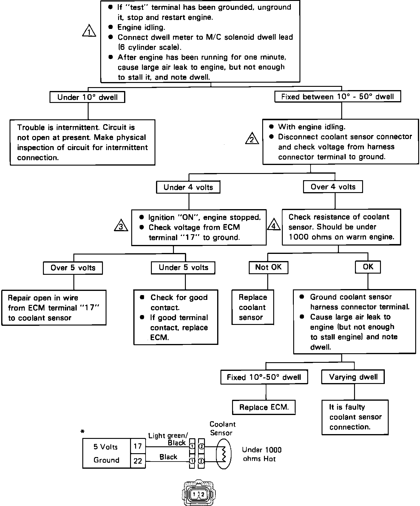 4. This step checks sensor resistance. If the reading is around 1000 ohms with a warm engine, the sensor is okay. Check for connector corrosion or low coolant level.