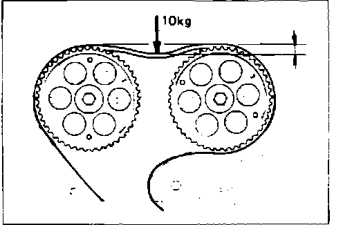 31. Turn the crankshaft by 60~ normally and measure deflection of the belt as shown in the figure. Make sure that it is within the specified range. If the deflection is not within the specified values, repeat the procedures from step 28 - 30. Belt tension at 10 kg (22.05 lbs.)