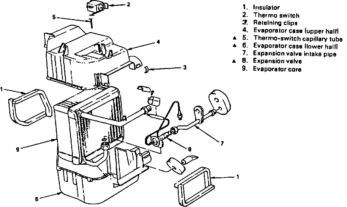 5. Remove evaporator case attaching nuts and bolts, then the evaporator assembly.