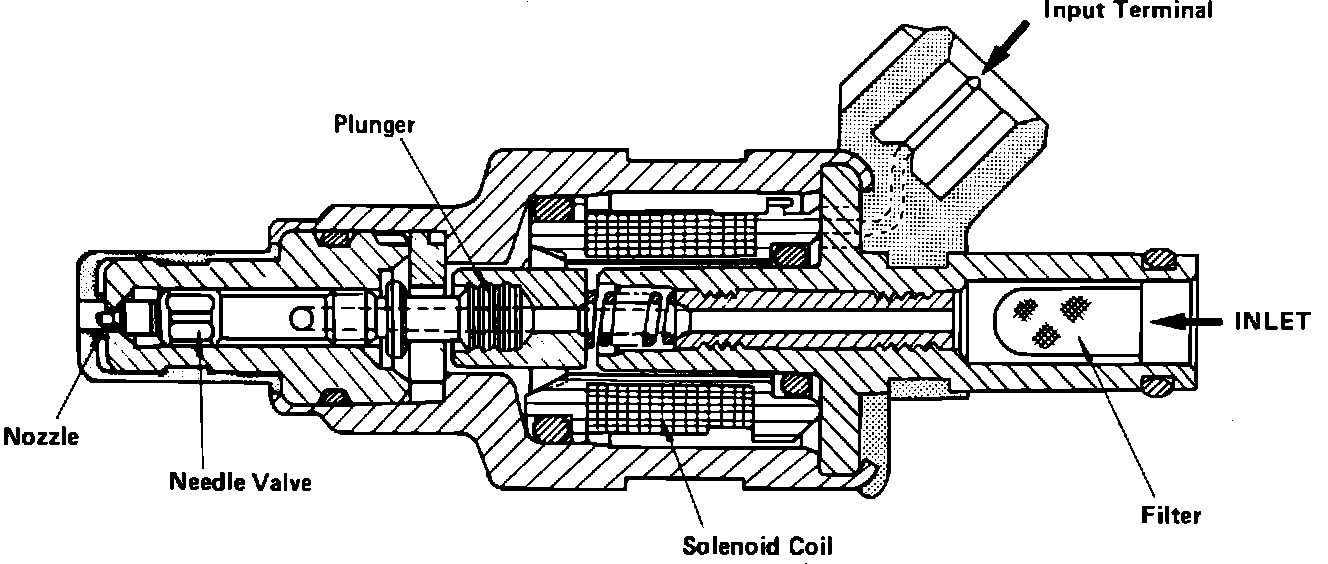 The injectors are "ON/OFF" solenoid valves installed one per cylinder on the intake manifold. The ECM sends pulses to energize (open) the injectors for varying lengths of time depending on its fuel requirement calculations, thereby controlling air/fuel ratio under a wide range of operating conditions. Dropping resistors are connected in series between the power source and injectors to stabilize the voltage to the injectors.