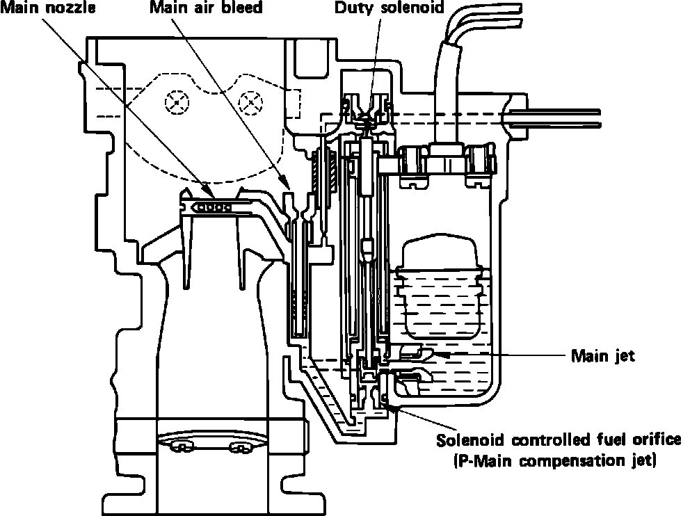 The duty solenoid is an integral part of the carburetor. Responding to various input signals (oxygen sensor, engine speed, coolant temperature, etc.), the ECM controls the continuous on and off cycling (duty cycle) of this solenoid. Also referred to as the mixture control solenoid, it opens and closes the carburetor main metering circuit, thus making ECM directed air/fuel ratio adjustments.