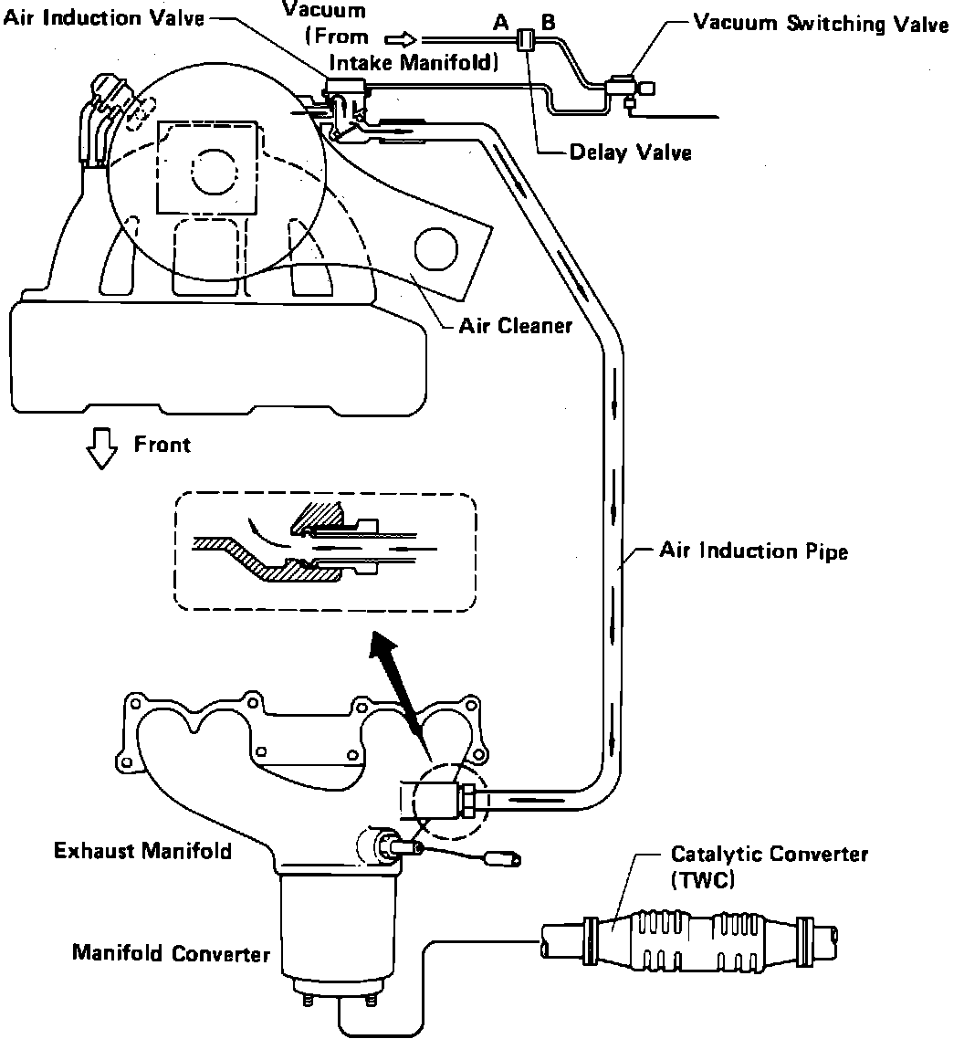 This vehicle is equipped with an AIR system known as "Pulse Air Induction". The system is designed to reduce hydrocarbon (HC) and carbon monoxide (CO) emissions by supplying filtered air, through the air induction valve, into the exhaust manifold. When this air meets the hot exhaust gases inside the manifold, combustion continues, further oxidizing the HC and CO in the exhaust. These pollutants are then converted into carbon dioxide and water vapor. After cold start-up, and during periods of engine warm-up the additional heat energy released helps to bring the catalyst up to operating temperature more quickly. The system consists principally of the induction valve, vacuum delay valve, vacuum switching valve, air induction pipe and ECM.