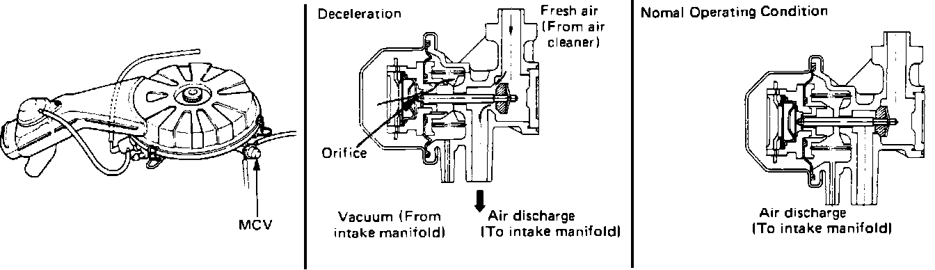The mixture control valve supplies fresh filtered air from the air cleaner to the intake manifold during deceleration, to prevent over enrichment of the air/fuel mixture and after burning in the exhaust manifold. The valve has a diaphragm, and two chambers (one on either side of the diaphragm) joined by a small orifice. The valve is controlled by manifold vacuum. When the throttle is closed suddenly, manifold vacuum increases rapidly in one chamber and the diaphragm opens the valve, allowing fresh air into the manifold. After a short time the pressure on either side of the diaphragm is equalized through the orifice, and a spring pushes the diaphragm back, closing the valve passage to the intake manifold.
