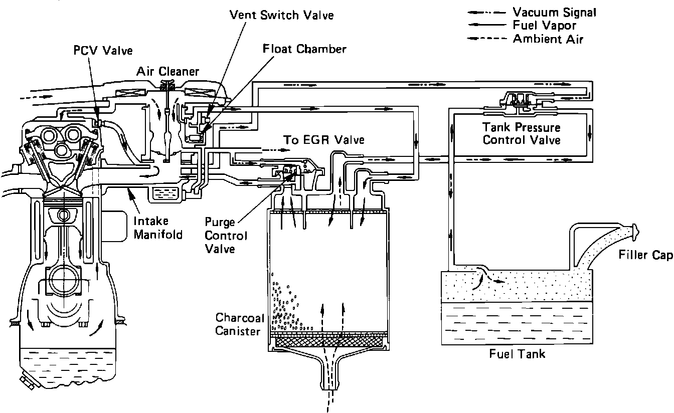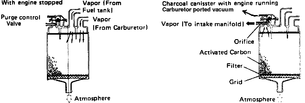 The Evaporative Control System consists of the fuel tank and filler cap, tank pressure control valve, a charcoal canister, a thermal vacuum valve, a vent switching valve (carburetor float bowl vent), a ventilation valve, and plumbing. The system collects fuel vapors from the tank and carburetor float bowl, that would otherwise be discharged into the atmosphere, and condenses them in a charcoal canister where they are temporarily stored. When the engine is started, the stored fuel and vapors are atomized with fresh air and directed to the intake to be burned in the engine. This system of vapor recovery helps not only to prevent raw hydrocarbon emissions, but also promotes fuel economy by eliminating fuel loss through evaporation.