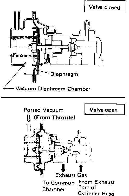 The EGR valve meters exhaust gas into the intake system. The EGR valve is normally closed. When the system is operating, throttle valve ported vacuum is applied to the diaphragm chamber of the EGR valve, causing the valve to open during acceleration and cruising conditions.