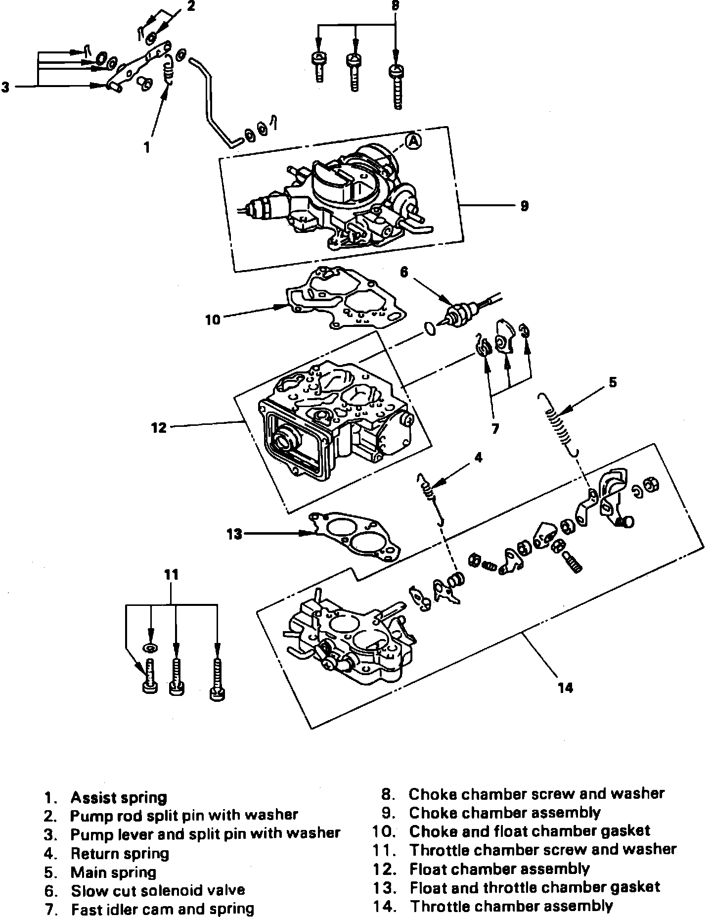 9. Remove float chamber assembly, float and throttle chamber gasket.