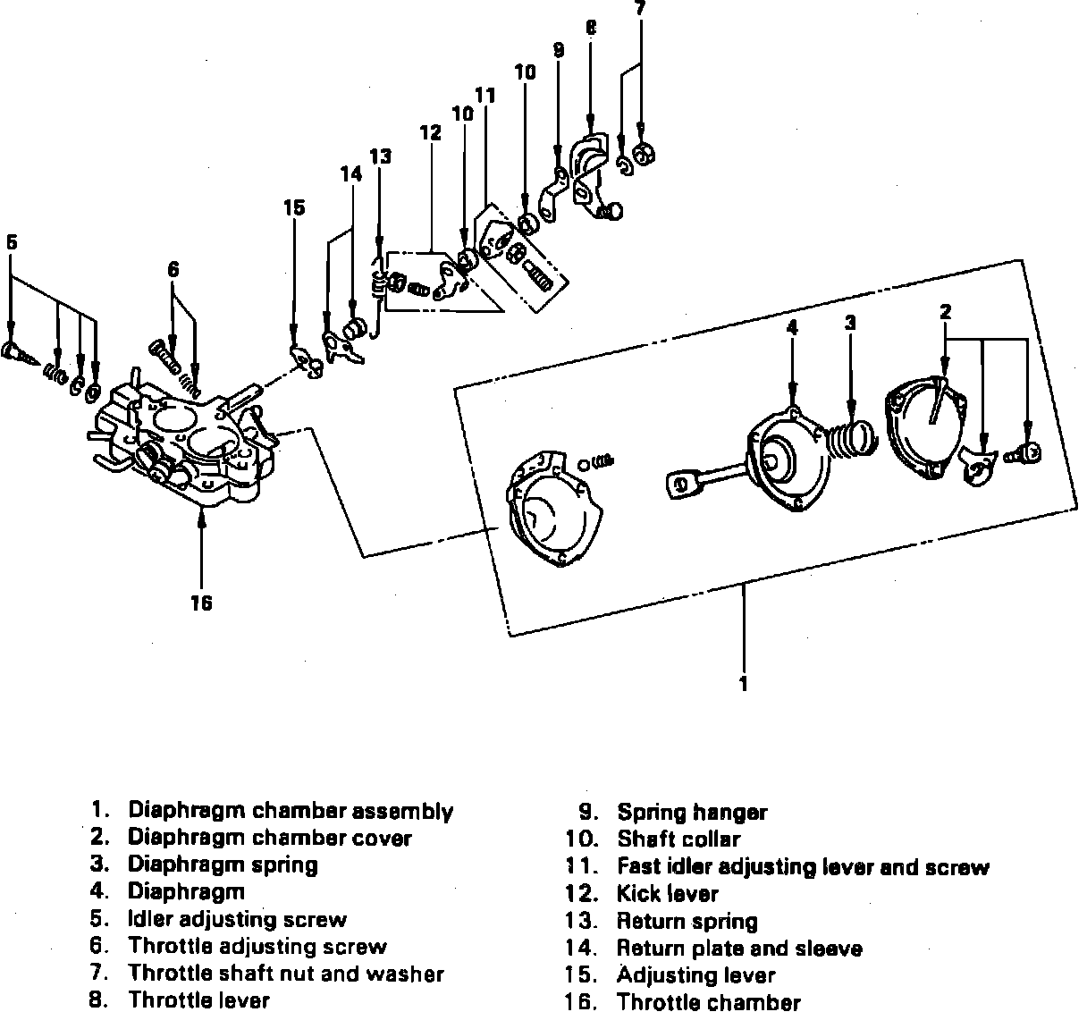 4. Install throttle adjusting screw, idler adjusting screw, diaphragm, diaphragm spring and diaphragm chamber assembly.