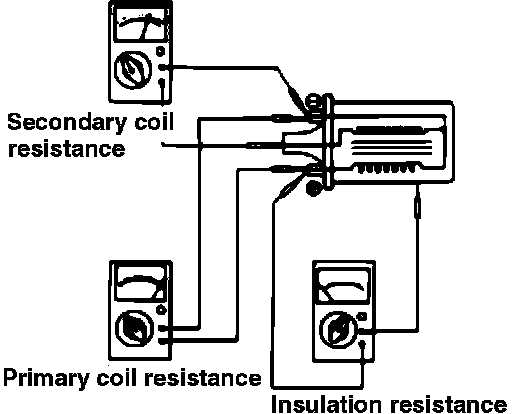 2. Check resistance of primary and secondary coil as shown in Fig. 1. Primary coil resistance should be 1.130--1.529 ohms. Secondary coil resistance should be 10,200--13,800 ohms.