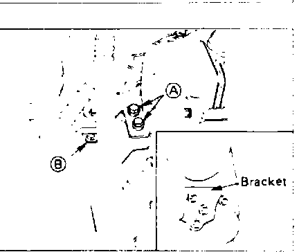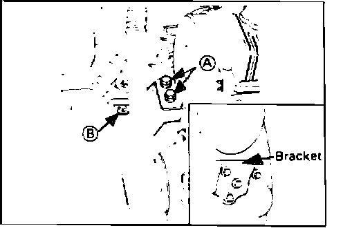 Remove the right side engine mount bolt (A) and engine mount bracket bolt (B). Then remove the body side engine mount cushion and the rear side torque rod.