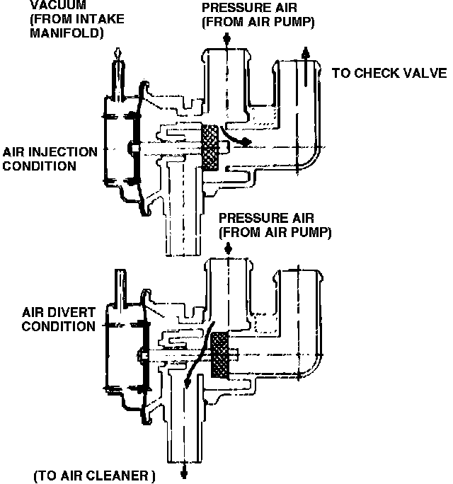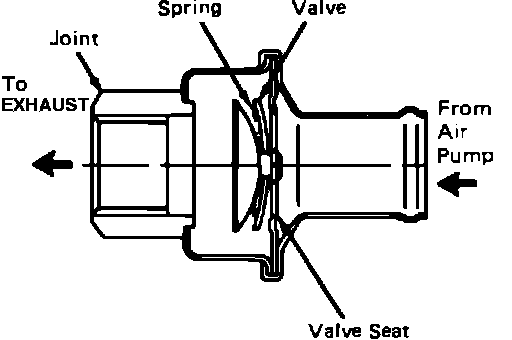 Remove check valve from air manifold. Test it for leakage by blowing air into the valve from the air pump side and from the exhaust side. If check valve is OK, air will pass through the valve from the air pump side only. A very small amount or air passing through from the exhaust side is allowable.