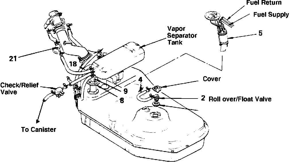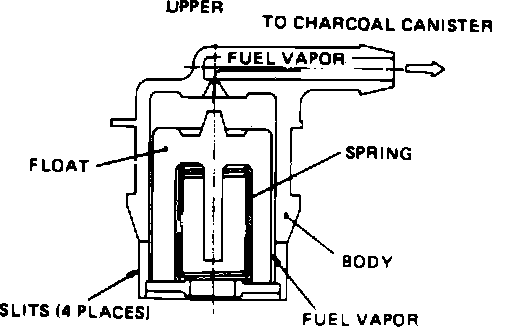 The check/relief valve is installed in-line to the charcoal canister. When the tank vapor pressure exceeds a specified level, the valve opens to relieve the excess pressure and let the vapors into the charcoal canister. When the vapor pressure in the tank is less than atmospheric by a specific value the valve allows ambient air from the canister to enter the tank to restore pressure equilibrium. Stated simply, the valve will open in either direction when the pressure differential is great enough. A slightly greater differential is required to relieve pressure within the tank, than is required to equalize lower than ambient pressures.