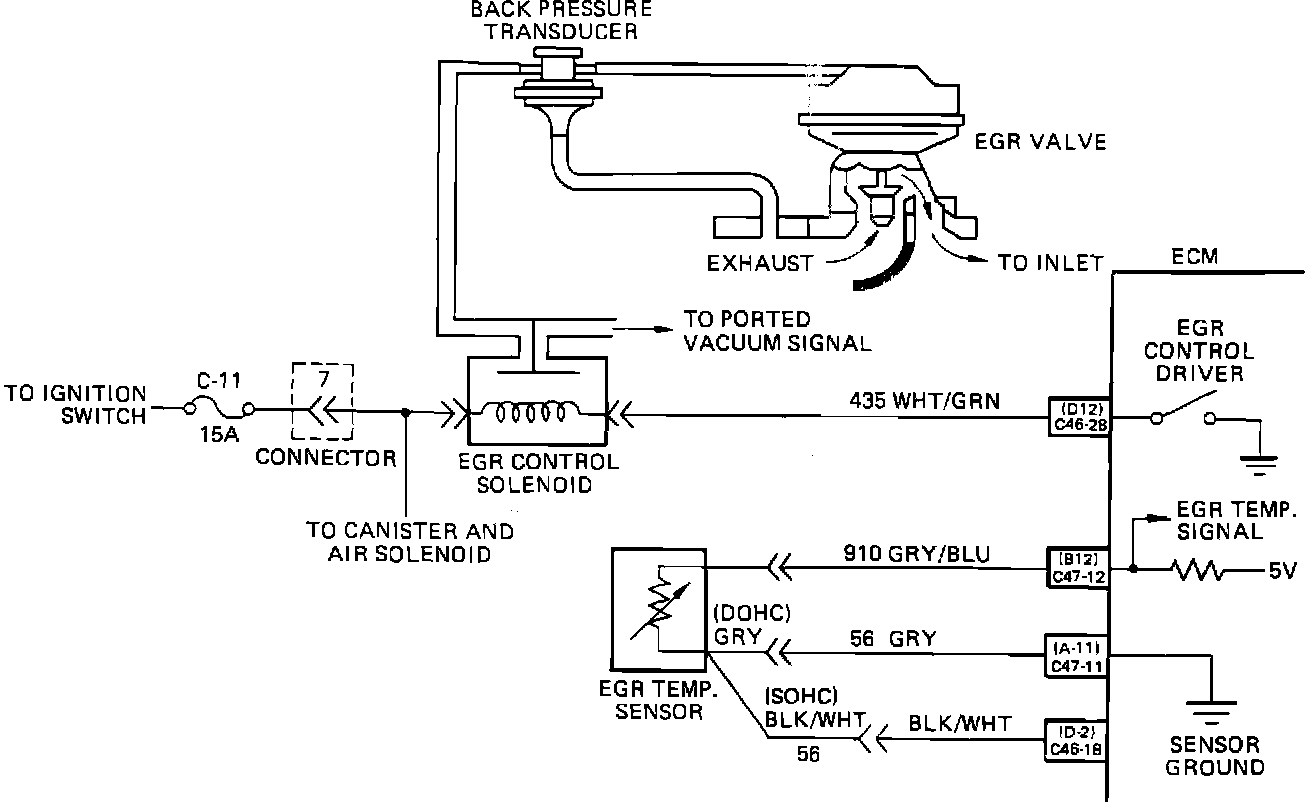The EGR vacuum valve is controlled by an ECM controlled solenoid. The ECM will turn the EGR "ON" and "OFF (Duty Cycle) by grounding CKT 435. The duty cycle is calculated by the ECM, based on information from the coolant temperature sensor and the throttle position sensor. With the ignition ON and the engine stopped, the EGR solenoid is de-energized and by grounding the diagnostic terminal, the solenoid is energized.