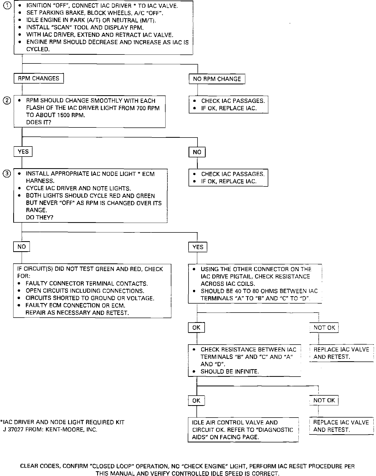 2. This step checks the quality of the IAC movement in step 1. Between 700 and about 2500 rpm, the engine speed should change smoothly with each flash of the tester light in both extend and retract. If the IAC valve is retracted beyond the control range (about 1500 rpm), it may take many flashes in the extend position before engine speed begins to drop. This is normal in some instances, fully expanding the IAC closes the passage causing engine stall.
