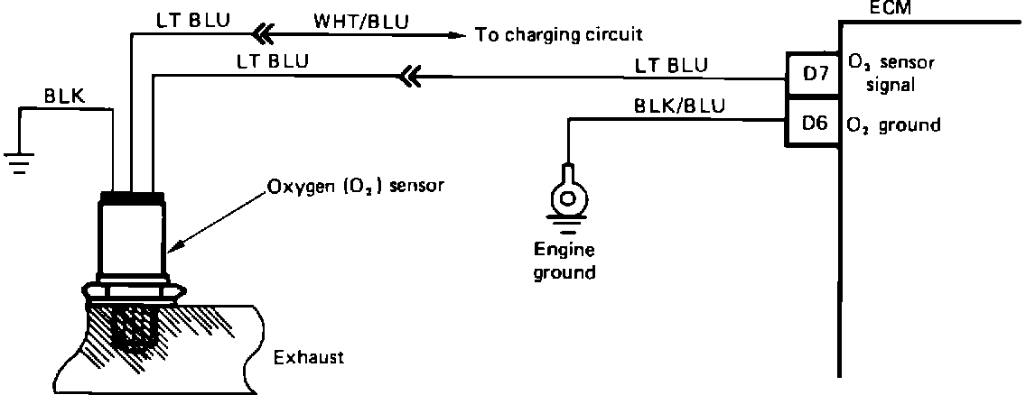 The ECM supplies a voltage of about .43 volt between terminals "D7" and "D6". (if measured with a 10 megohm digital voltmeter, this may read as low as .32 volt.) The O2 sensor varies the voltage within a range of about 1 volt, if the exhaust is rich, down through about .10 volt, if exhaust is lean. The sensor is like an open circuit and produces no voltage, when it is below about 360~ (600~F). An open sensor circuit, or cold sensor, causes "Open Loop" operation.