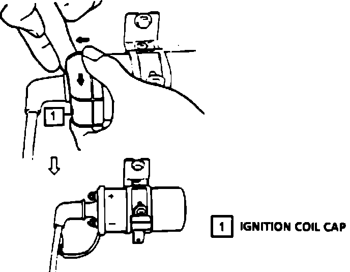 This ignition system has a remotely mounted ignition coil. The coil is a transformer which steps up battery voltage (12 volts) to high voltage (25,000 to 35,000 volts). The primary circuit is energized when the ignition switch is in the "ON" position. When the ignition module breaks the circuit to ground, on the primary (negative side of coil) circuit, the magnetic field collapses, which induces high voltage in the secondary circuit, which finds its ground at the spark plug.