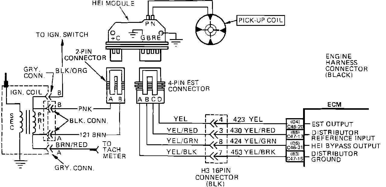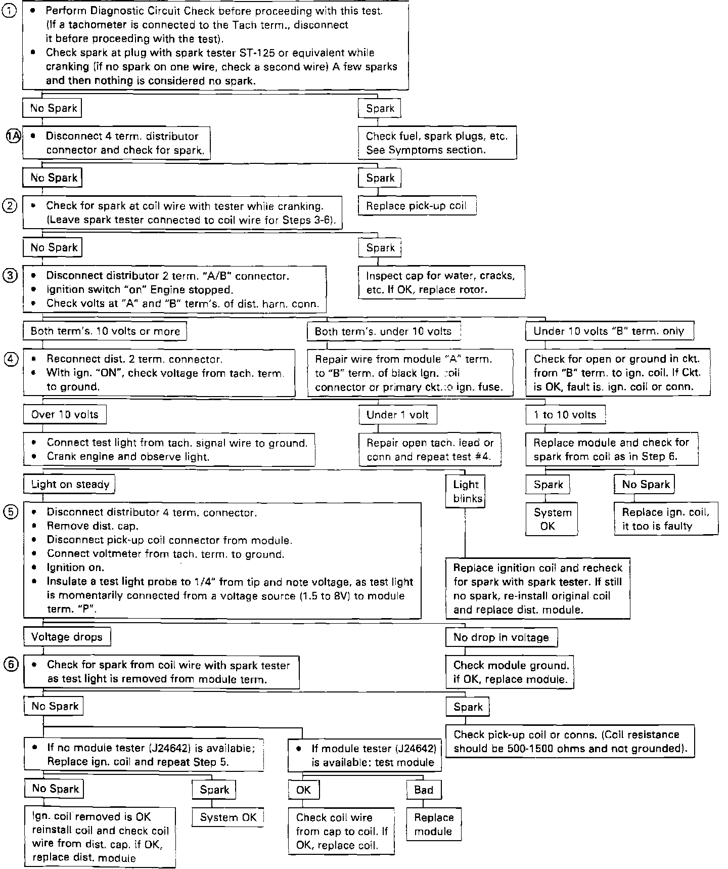 1A. If spark occurs with 4 terminal distributor connector disconnected, pick-up coil output is too low for EST operation.